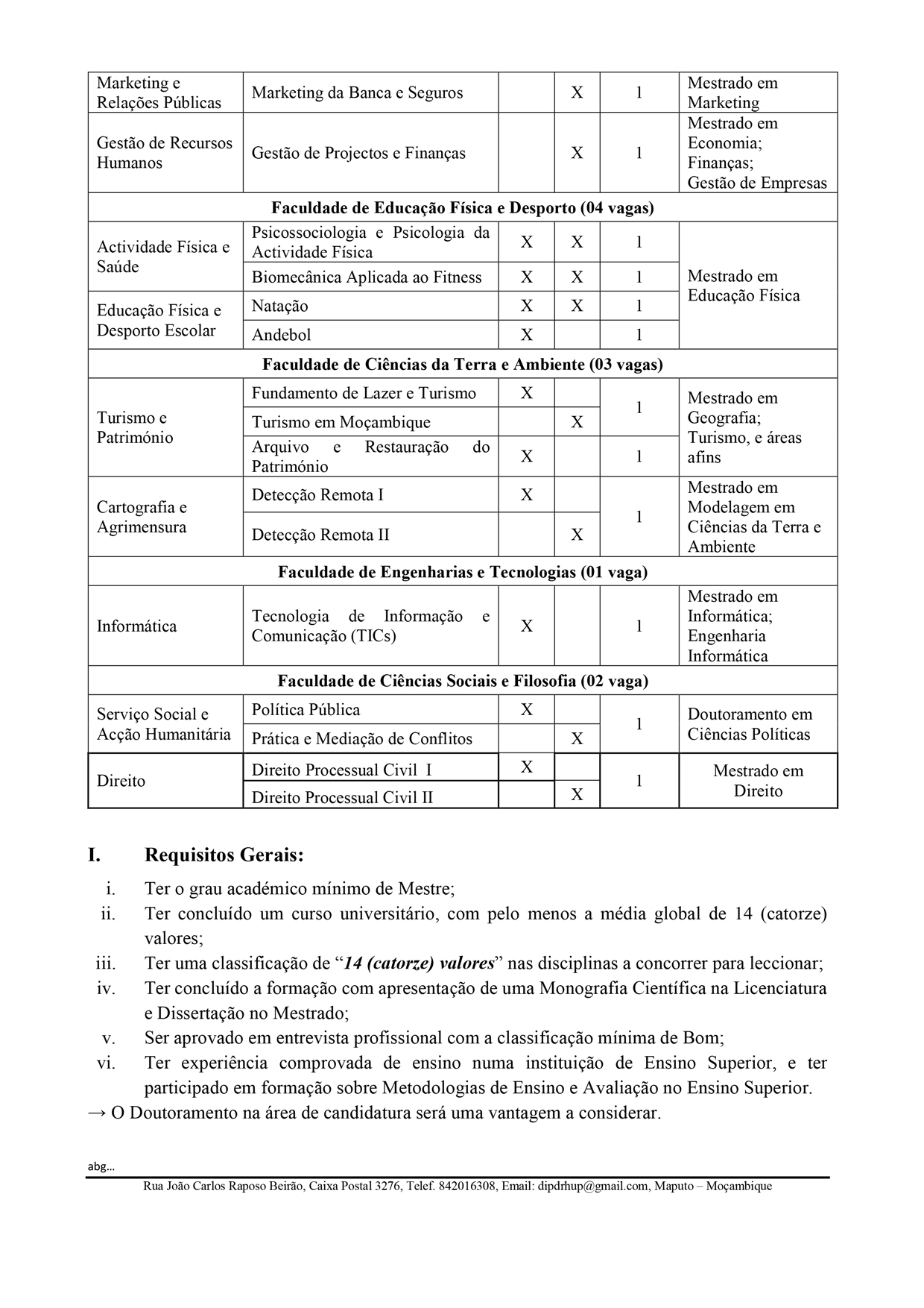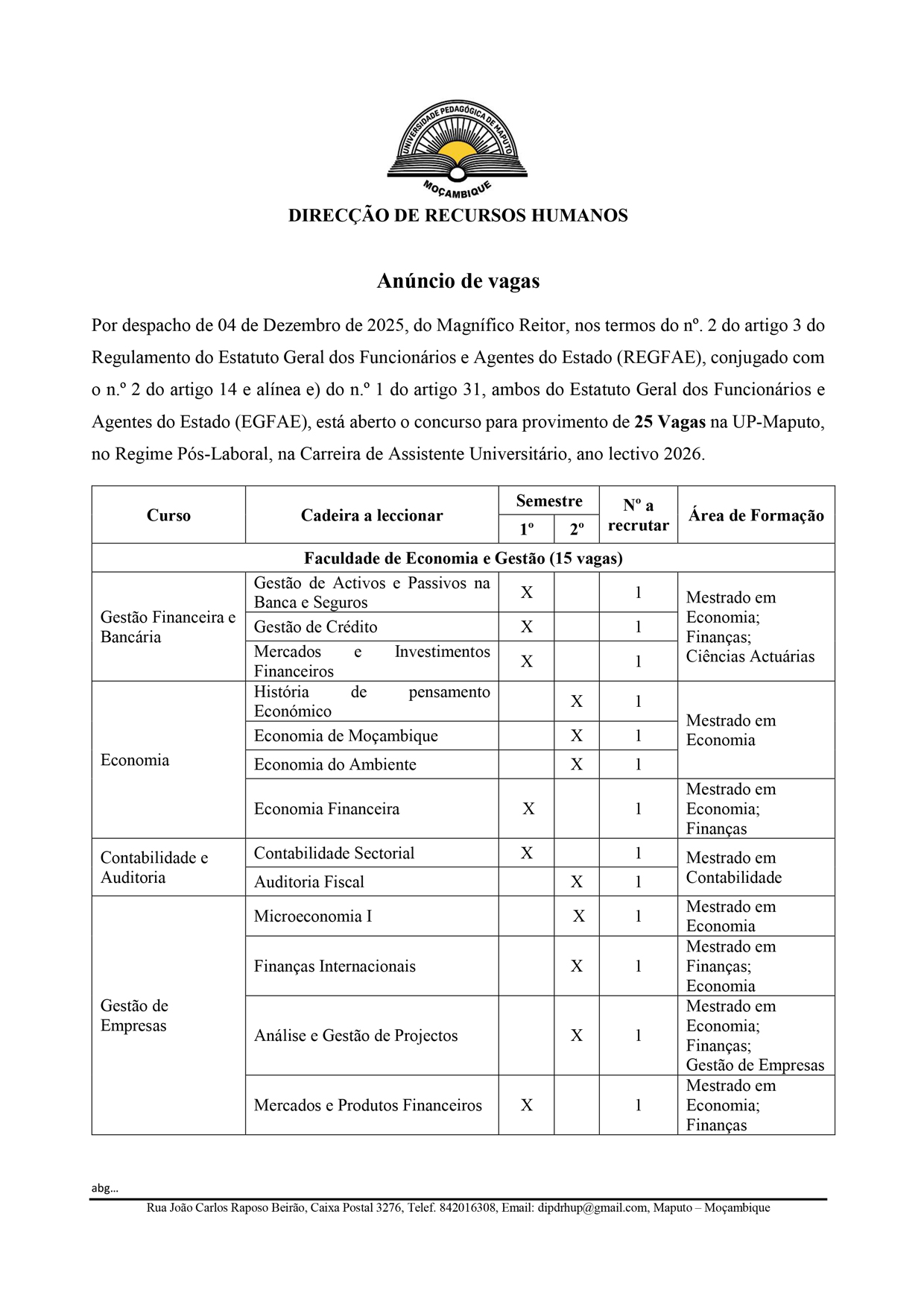 A Universidade Pedagógica de Maputo (UP-Maputo) torna público que se encontra aberto o concurso de contratação de docentes para o provimento de 25 vagas nas carreiras de Docente e Assistente Universitário, para leccionar no regime pós-laboral, no ano lectivo de 2026.
