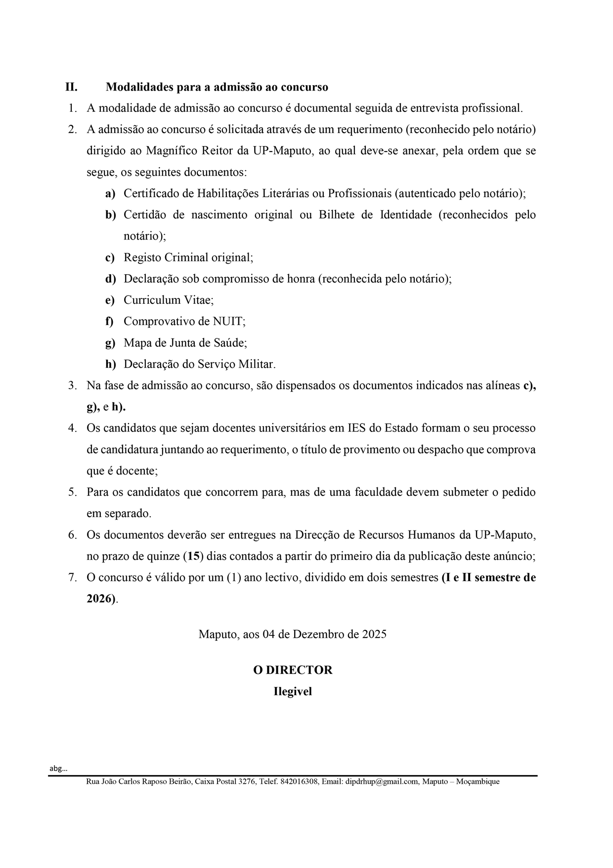 A Universidade Pedagógica de Maputo (UP-Maputo) torna público que se encontra aberto o concurso de contratação de docentes para o provimento de 25 vagas nas carreiras de Docente e Assistente Universitário, para leccionar no regime pós-laboral, no ano lectivo de 2026.